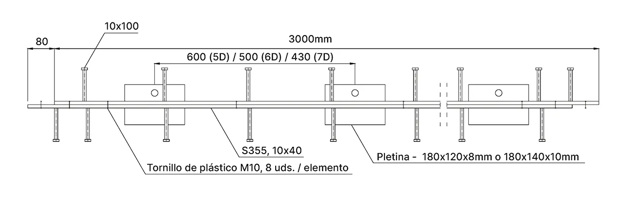 - Distancia estándar entre las pletinas: 600mm (tipo 5D)