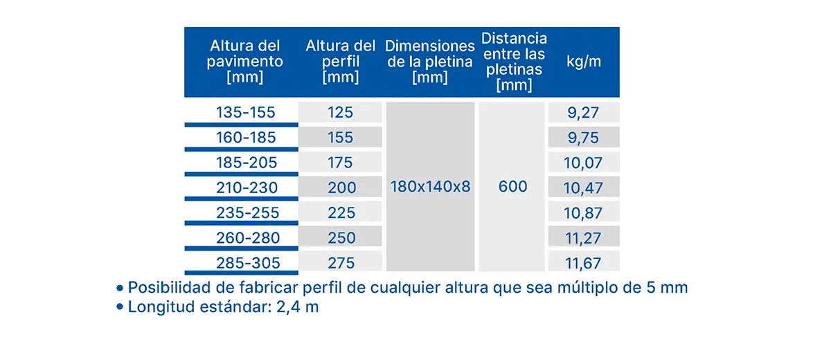 - Posibilidad de uso de más pletinas en un perfil (5D, 6D) para aumentar la capicada de carga del pavimento